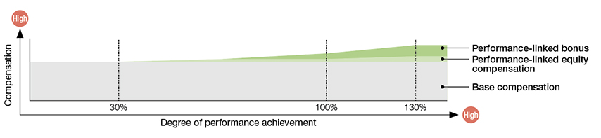The ratios of base compensation and performance-linked compensation are appropriately determined taking into account Nishimatsu Construction’s management strategies, business environment, and the level of difficulty of achieving job responsibilities and targets, while also referencing relevant changes at other companies in our industry. To enhance the incentives to increase corporate value over the medium-to-long term, base compensation was reduced and performance-linked compensation was increased in FY2025, resulting in a ratio of base compensation to performance-linked compensation of approximately 7 to 3. Within performance-linked compensation, there is generally a two-to-one ratio of cash-based compensation to stock-based compensation.