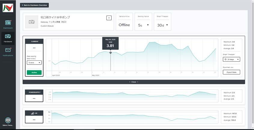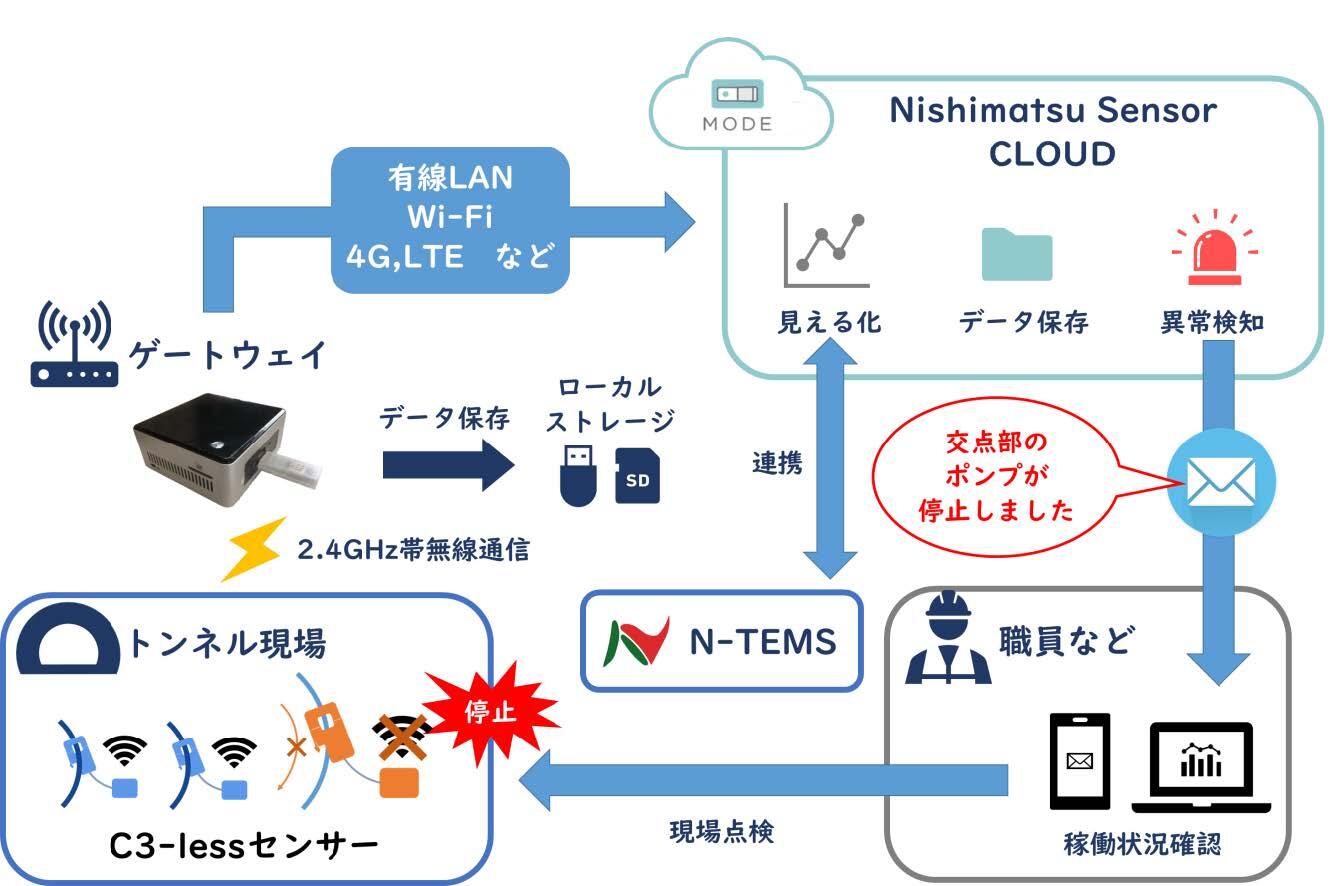 本システムを活用することで、水中ポンプの稼働を無人監視し、トンネル坑内の水没を未然に防ぐことが期待されます。