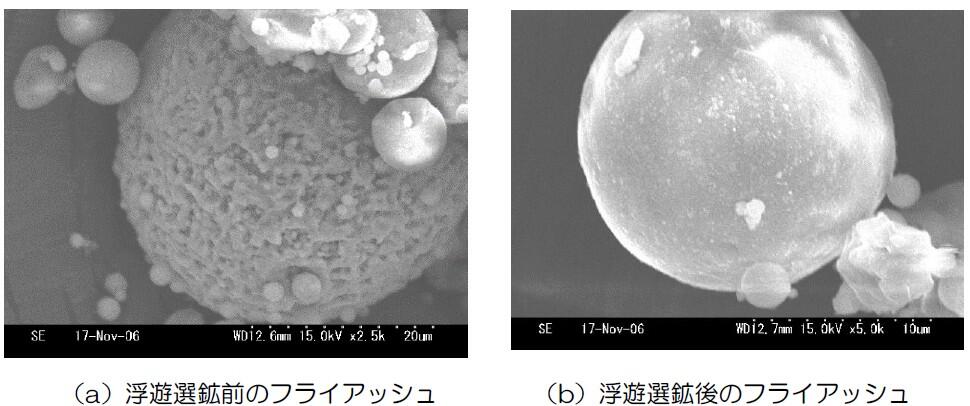 低品位フライアッシュに水を加えてスラリー化したのち、浮遊選鉱の原理を用いてフライアッシュから未燃カーボンを分離します。未燃カーボンの多いフライアッシュは、写真-1(a)のように未燃カーボンがフライアッシュの表面に付着していますが、浮遊選鉱後のフライアッシュは写真―1(b)のようにフライアッシュに付着した未燃カーボンが除去されています。