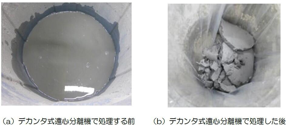 浮遊選鉱で得られたフライアッシュは、写真-2(a)のようにスラリー状のため、そのままではジオポリマーの材料として使用できません。そこで、デカンタ式遠心分離機により、水分量を減らしスラリーから図―2(b)に示すようなケーキ状にします。