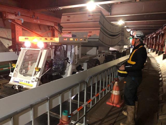 通常、タイヤ式運搬車はレール式運搬車に比べ、セグメントの受け取り位置合わせが難しいのですが、この運搬車両は、自動誘導ステアリングによって、より正確な位置に誘導できるようになりました。さらに、運転者の安全確保のために、リフター下部での操作は遠隔操作により無人で進入退出できるようにしました。