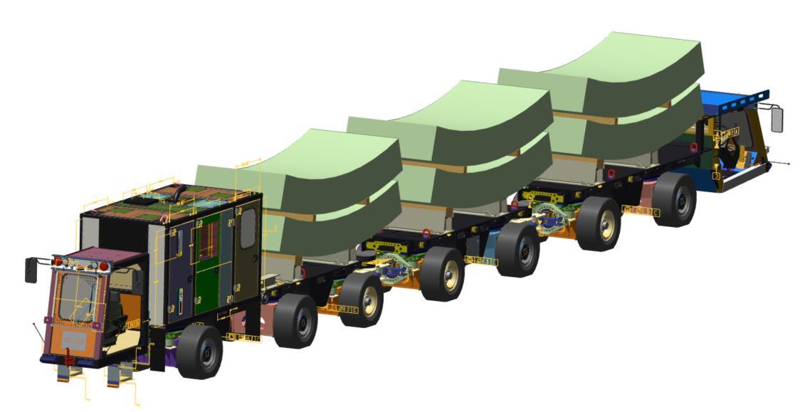 TSPは、3台の車両を1編成として構成され、各車両は2ピースのセグメントを搭載できます(各20トン)。