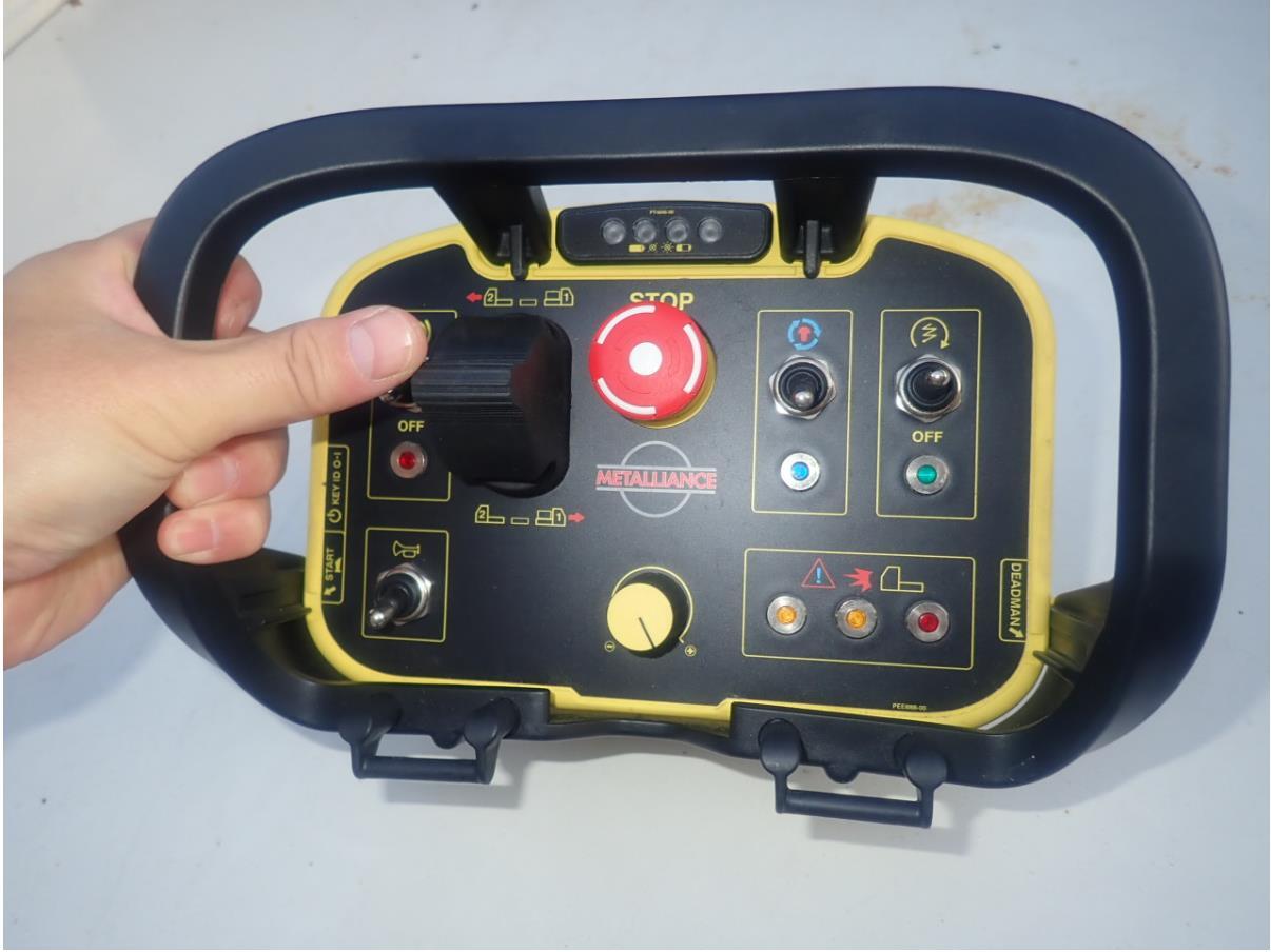 遠隔無線操作によるTSPの運転は、自動誘導モード時に使用します。機械が狭い通路を走行する時やセグメントリフター下部を走行する時など、運転席で操作すると危険が伴うため、遠隔無線操作で走行させます。無線操作では、機械の前後進、エンジンの始動停止、緊急停止および解除、警報音、パーキングブレーキの操作ができます。(ステアリングは自動)
