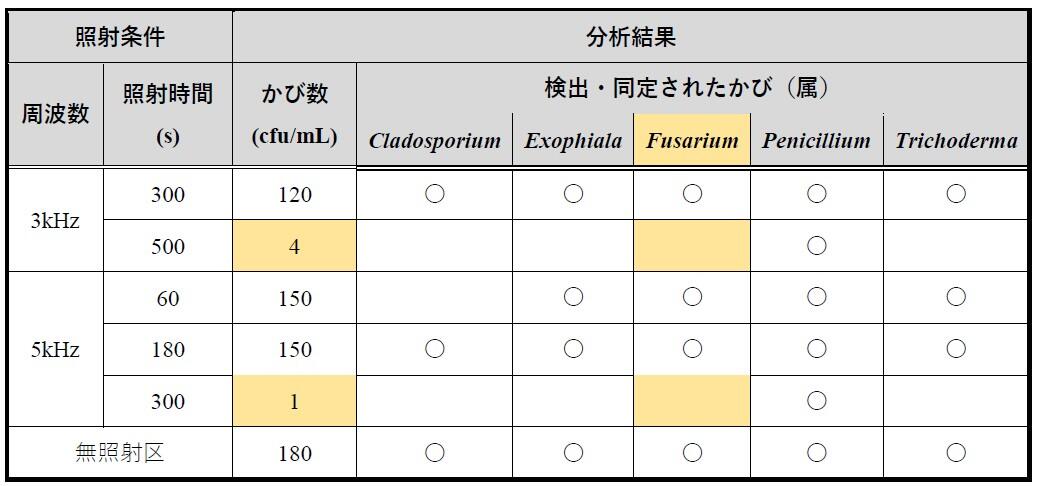 表-1 プラズマの異なる照射条件が培養液中のかびに及ぼす影響