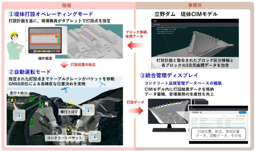 立野ダム堤体工での試験運用を通してシステムの改良を進め、他のコンクリートダム工事へ展開することで、施工の省人化、無人化への取り組みを加速させていきます。