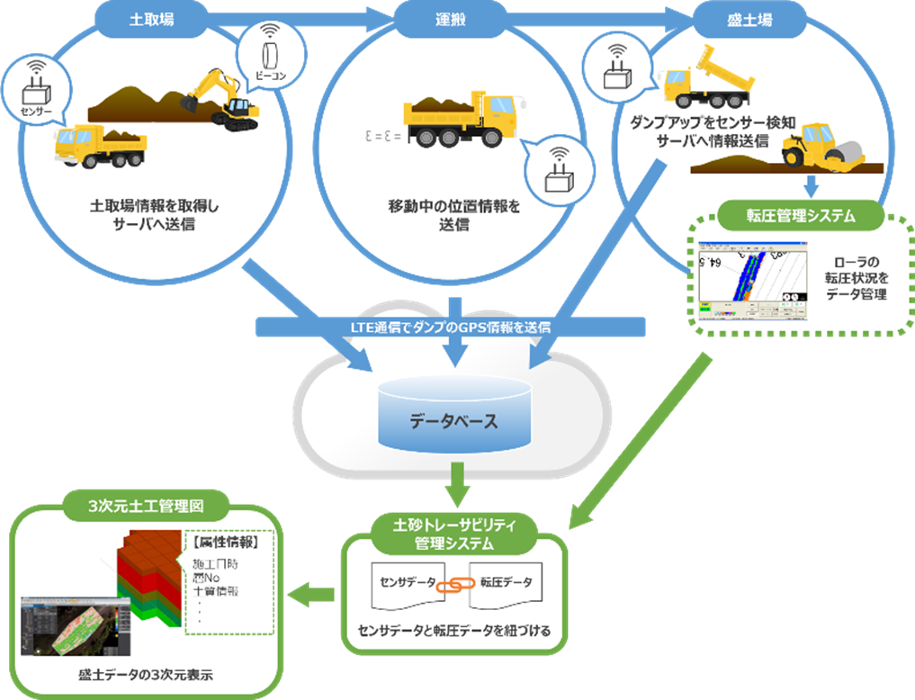 盛土材の土取り位置と荷下し位置や施工位置の情報が自動的に管理され、盛土材のトレーサビリティが強化され品質向上に繋がります。