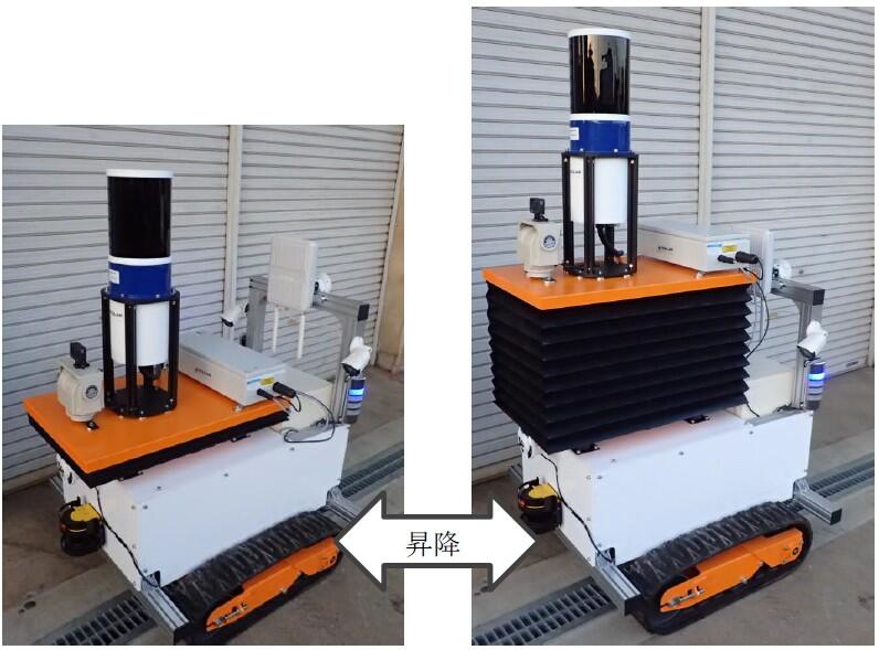 計測台車のサイズは幅100cm×長さ115cm×高さ150cm程度、足回りはクローラとなっており、重機との離合、狭隘な箇所や不整地での走行・旋回が可能であるため、掘削サイクルの合間に迅速に計測作業を行うことができます。また、機器の搭載箇所は昇降リフトとなっており、計測機器の使用場面に応じて高さを調節することができます(図2)。その他に、周囲確認用カメラ、ラインスキャナを用いた計測台車の緊急自動停止システム、動力源として排気ガスを出さないリチウムイオンバッテリーを装備することで、トンネル坑内の走行における安全性や環境の保全を図っています。