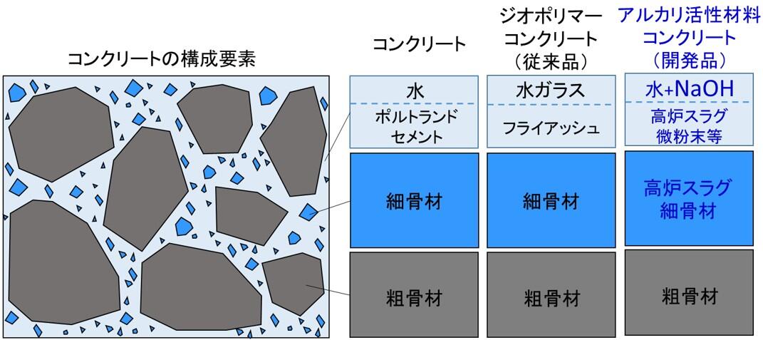 アルカリ活性材料コンクリートは、製造過程で相当量のCO2が発生する一般的なセメント(ポルトランドセメント(※3))を使用しない低炭素型コンクリートであり(図1)、通常のコンクリートに比べて、製造時に排出するCO2を大幅に削減できます。しかし、混合時の粘性が高く早期に固まりやすいなど、施工時の流動性を確保することが難しいため、意匠性に優れた複雑な形状のプレキャストコンクリート製品への展開が課題でした。