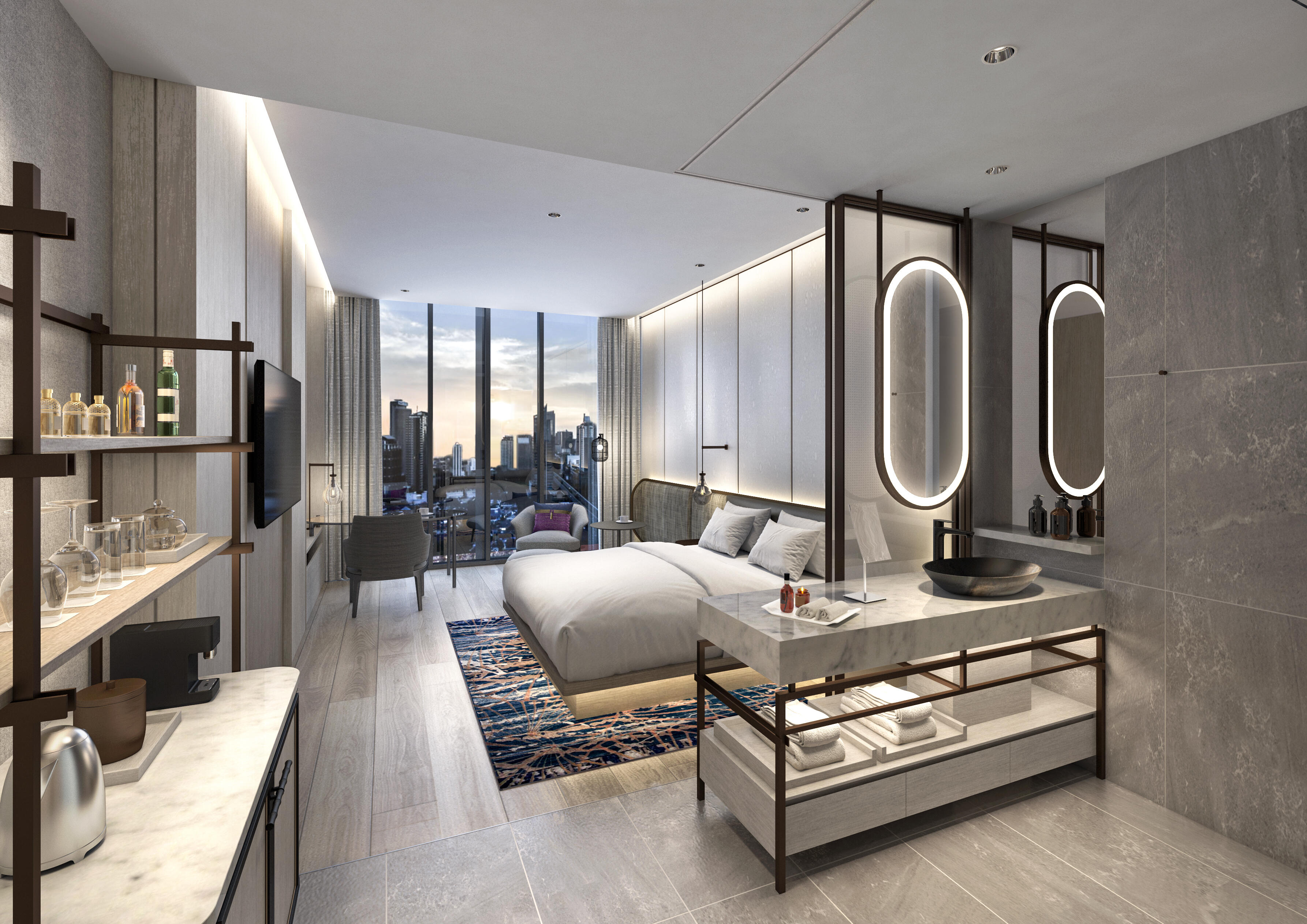 標準客室面積は約40㎡。総客室数はスイートルーム13室を含む405室で、このうち、長期滞在用の客室として36部屋を設ける予定です。ダイニングは、オールデイダイニング、日本料理、鉄板焼を用意し、最上階の34階には、バンコクの夜景が一望できるルーフトップバーも備え、バンコクにおいても多様なスタイルの食体験を堪能することができます。