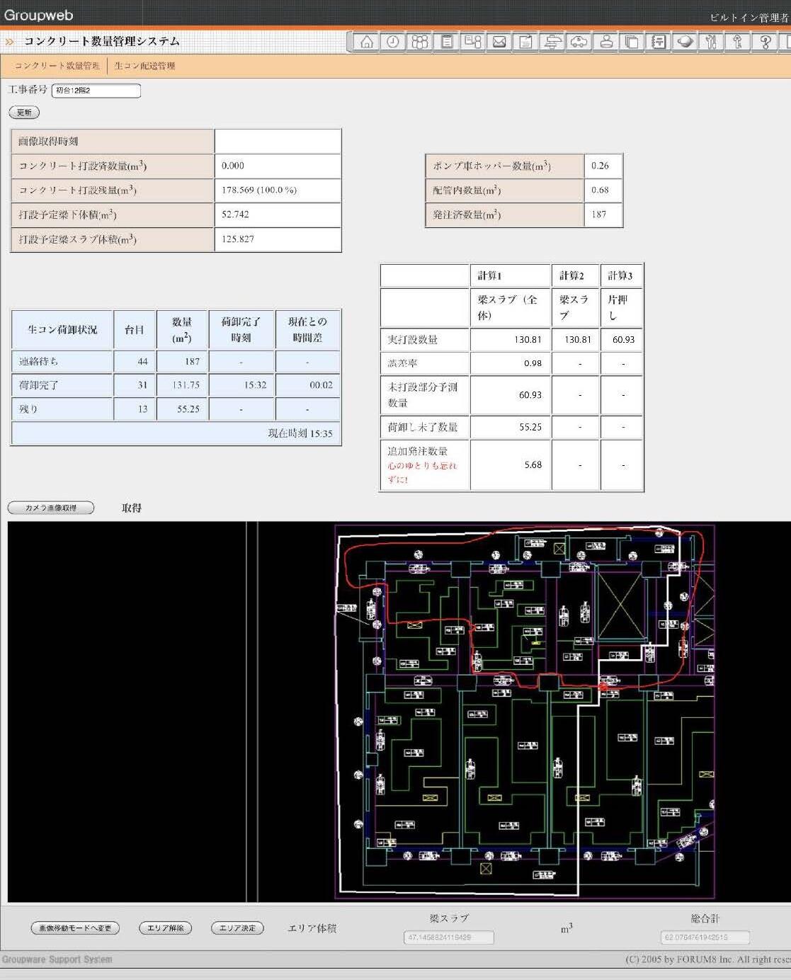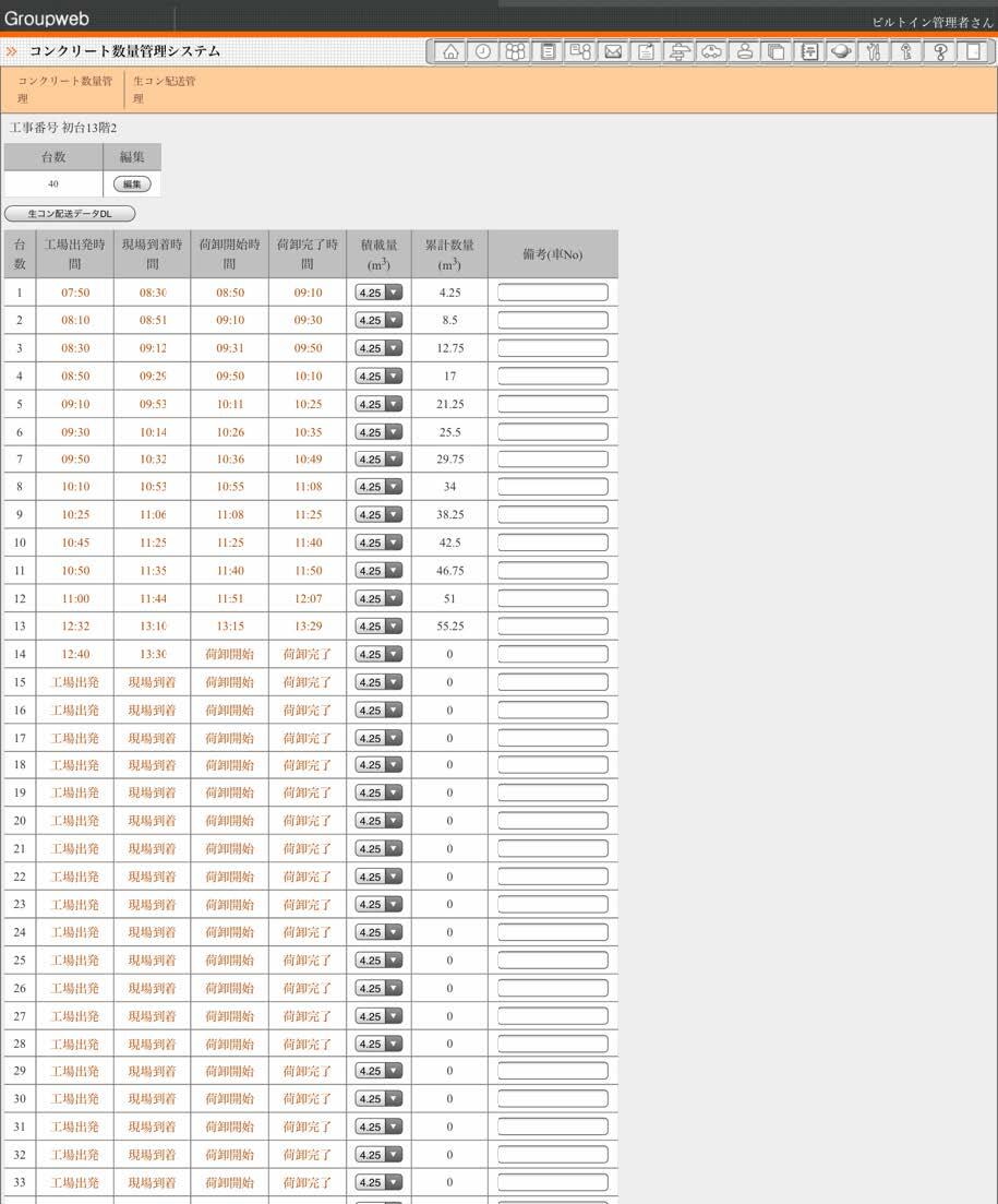 また、同システム上の配送管理者用画面で、配送管理者がアジテータ車のコンクリート荷卸完了時に時刻を入力することで、所定の時間内に荷卸したコンクリート数量がシステムに登録されます。未打設範囲のコンクリート体積とあらかじめ発注しているコンクリート数量と荷卸したコンクリート数量の情報から、追加発注するコンクリート調整数量を自動計算します。