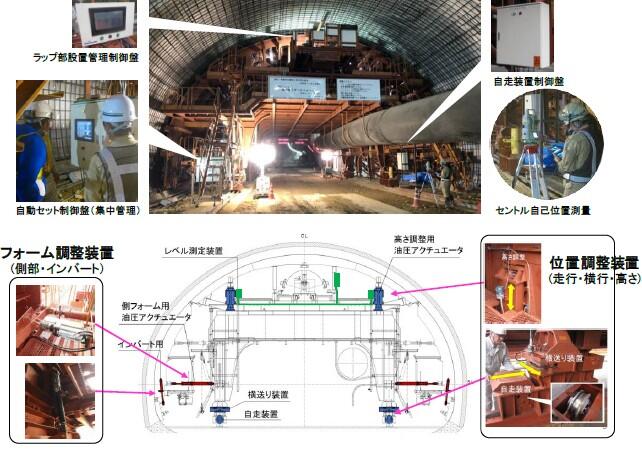 測量機器やアクチュエータ、各種センシング装置などと連携し、専用制御盤での操作でセントルを所定位置へ正確にセットできるシステムです(図-1)。自動追尾トータルステーションで取得したセントルの自己位置データと設計値との差分値に基づき、セントルの位置や姿勢が自動調整され、さらにフォームを所定位置まで安全に自動拡幅します。従来6人で60~90分ほど要していた作業が、最小2人で半分以下の時間にまで短縮できました。また、最終セットはトンネルの設計寸法ではなく既設覆工の出来形に合わせてセントルを調整セットするため、段差や隙間がなく、セントルの据付誤差は従来の人力による作業と同程度の3mm以内でした。