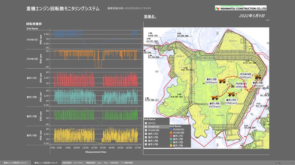 また、本システムのエンジン稼働状況の経時変化を可視化したデータを活用し、重機の作業効率や作業量算出し、重機の台数計画や組み合わせを策定し施工を進めることにより、効率的な重機の運用が可能となり、CO2の発生を最低限に抑制するのみならず生産性が向上することが期待されます。順次システムの導入を拡大し、脱炭素に寄与するシステムを目指します。