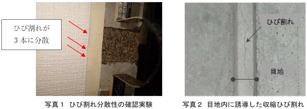 ・目地内に収縮ひび割れ(写真2)を誘導する鉄筋挿入型ひび割れ制御工法(CCB工法)と併用することによって,より確実に直貼りクロス仕上げ面の変状を防止する。![]()