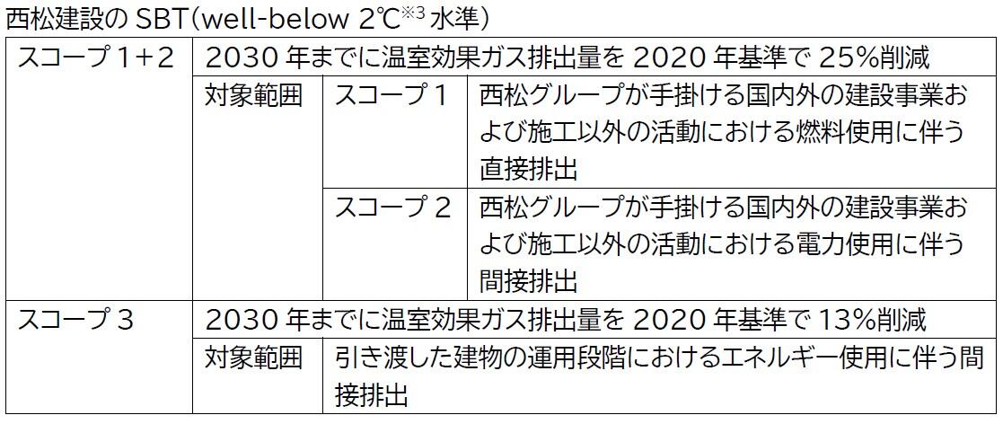 当社は、国内建設事業に関する2030年を年限とする脱炭素削減目標『ZERO30ロードマップ2021』※2を策定しておりますが、この度、これをベースとして西松グループ全体の温室効果ガス削減目標を策定し、SBT認定を取得しました。
