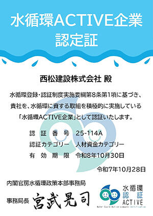 当社は、内閣官房水循環政策本部事務局が主催する「水循環企業登録・認証制度」において、水循環ACTIVE企業に認証されました。本制度は水資源に資する取り組みを積極的に登録・認証しインセンティブを高め、より一層の企業の取り組みを促し、社会全体で水循環に向き合うことを目的としています。今回の認証では、当社が取り組む「にしまつの森保全活動」と「御前山ビオトープ育成活動」が評価されました。