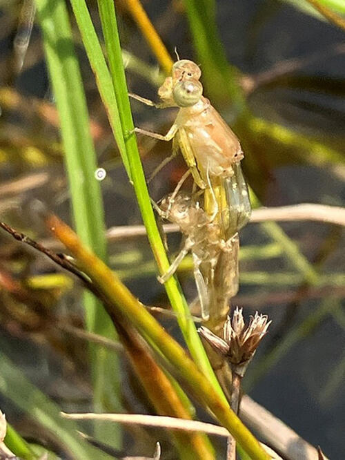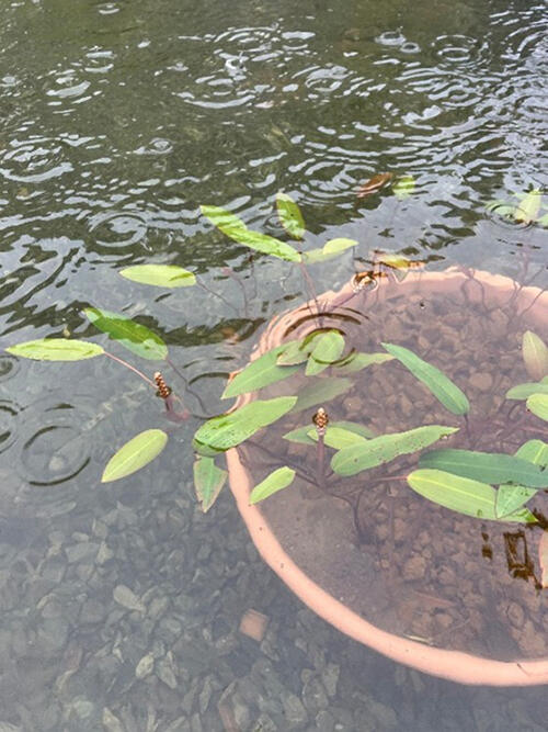 『中津クロスポイント®』は、技術研究所内の緑地の再整備に伴い、2024年4月に地域性の在来植物を中心に整備されたビオトープであり、428m2 の敷地内に多様な生物の生活様式に合わせて、池、小川、田んぼ、雑木林、草地等の多様な環境を創出しました(写真1)。これまでキイトトンボをはじめとする希少な昆虫類の繁殖が観察される等、新たな生態系保全の場が形成されつつあります(写真2)。また、地元の環境市⺠団体と協⼒して、ヒルムシロやミズニラ等の希少な水生植物や在来植物の保全にも取り組んでいます(写真3)。