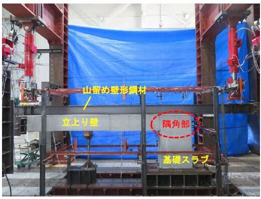 CUW工法を免震建物に適用する際、免震ピットの立上り壁に作用する側圧※3によって生じる断面力に対して、構造安全性を確保できる隅角部が必要です。しかし、これまで立上り壁と隅角部に関する具体的な設計方法が明示されていませんでした。そこで、構造実験を行い、立上り壁に作用した側圧が隅角部に及ぼす構造的な影響を確認し、立上り壁と隅角部の設計方法を確立し、設計指針に追加しました。